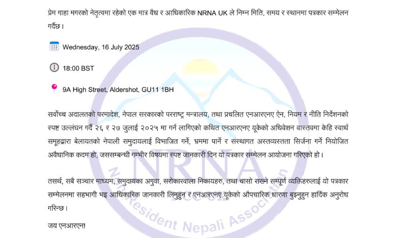 एनआरएनए यूकेको कार्यसमितिले आगामी बुधबार, १६ जुलाई २०२५, साँझ ६ बजे, Thamel Restaurant, Aldershot मा पत्रकार सम्मेलन गर्ने भएको छ।