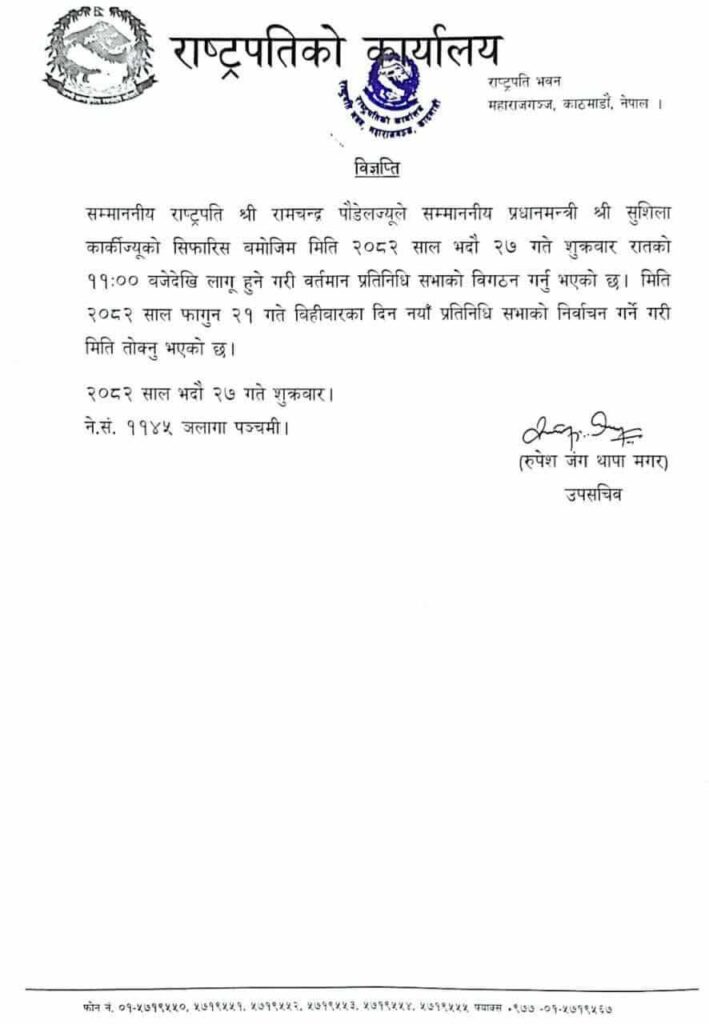 राष्ट्रपतिले यही भदौ २७ गते शुक्रबार रातको ११ः०० बजेदेखि लागू हुने गरी वर्तमान प्रतिनिधिसभाको विघटन गरेको राष्ट्रपति कार्यालयका उपसचिव रुपेशजंग थापा मगरद्वारा हस्ताक्षरित विज्ञप्तिमा उल्लेख छ ।