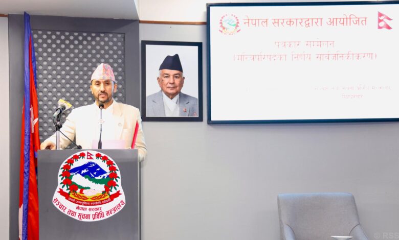 मन्त्रिपरिषद्को बैठकले अनलाइन सञ्चारमाध्यम दर्ता गर्ने प्रयोजनका लागि सूचना तथा प्रसारण विभागको महानिर्देशकलाई स्थानीय अधिकारीका रूपमा तोक्ने, सुरक्षण मुद्रणसम्बन्धी नियमावली, २०८२ स्वीकृत गर्ने र सञ्चार तथा सूचना प्रविधिमन्त्रीलाई नेपाल सरकारको प्रवक्ता तोक्ने निर्णय गरेको सञ्चारमन्त्री खरेलले जानकारी दिनुभयो ।
