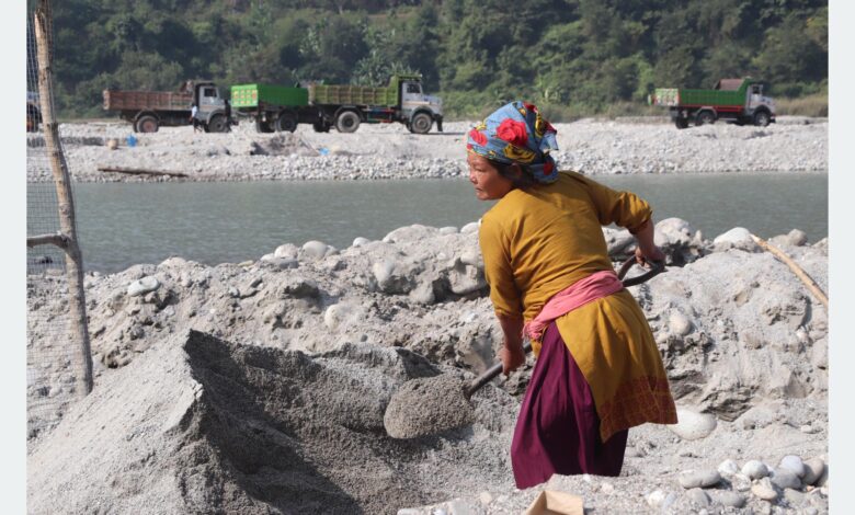 मलेखु (धादिङ), २६ मङ्सिरः हातमा बेल्चा (साबेल), टाउकामा रुमाल र कम्मरमा सलको पटुकी । एकाबिहानै बालुवा सार्दै गर्नुभएको अवस्थामा भेटिनुभयो, कल्पना भुजेल । कठ्याङ्ग्रिँदो जाडोेमा पनि खलखल पसिना बगिरहेको छ, तर उहाँलाई यसको कुनै प्रवाह छैन । भुजेल भन्नुहुन्छ, “हाम्रो काम उज्यालो भएदेखि अँध्यारो नभएसम्म बगरमा बालुवा खोज्ने हो । एकदिन अल्छी गर्यो भने अर्काे दिन चुल्हो बाल्न गाह्रो हुन्छ । बिरामी परियो भने औषधि खाने पैसा हुँदैन । त्यसैले चिसो, गर्मी केहीको प्रवाह हुँदैन ।”